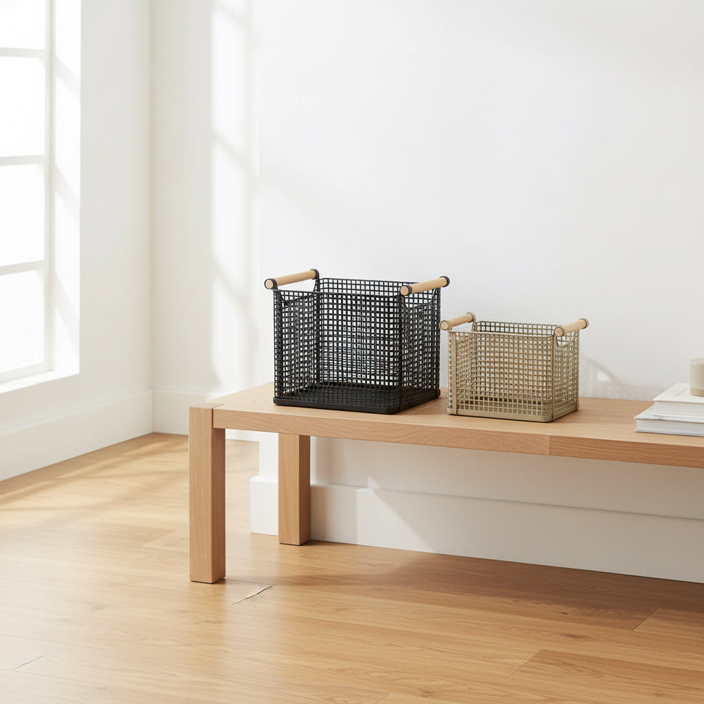 ¡Organiza y decora con estilo industrial! Nuestro set de 2 Canastillas de metal serán perfectas para tu baño o habitación. En acabado negro y dorado. Almacena tus artículos con facilidad y dale un toque moderno a tu hogar. ¡Haz que la organización sea divertida y elegante!