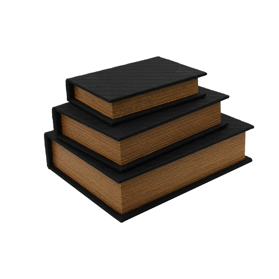 Este set de 3 libros-caja presenta un diseño texturizado único. Son perfectos para guardar tus objetos  y agregar un toque decorativo a tu hogar. Organiza tus pertenencias con estilo. Con un diseño elegante y espacioso, este elemento te permitirán organizar de una manera sofisticada.