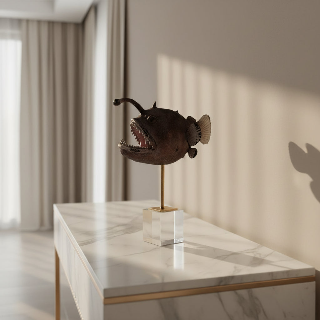 Esta figura decorativa náutica está hecha de resina con base de cristal, contiene un detalle artístico de un pez linterna. El accesorio ideal para cualquier ambiente marino. Una figurilla única.